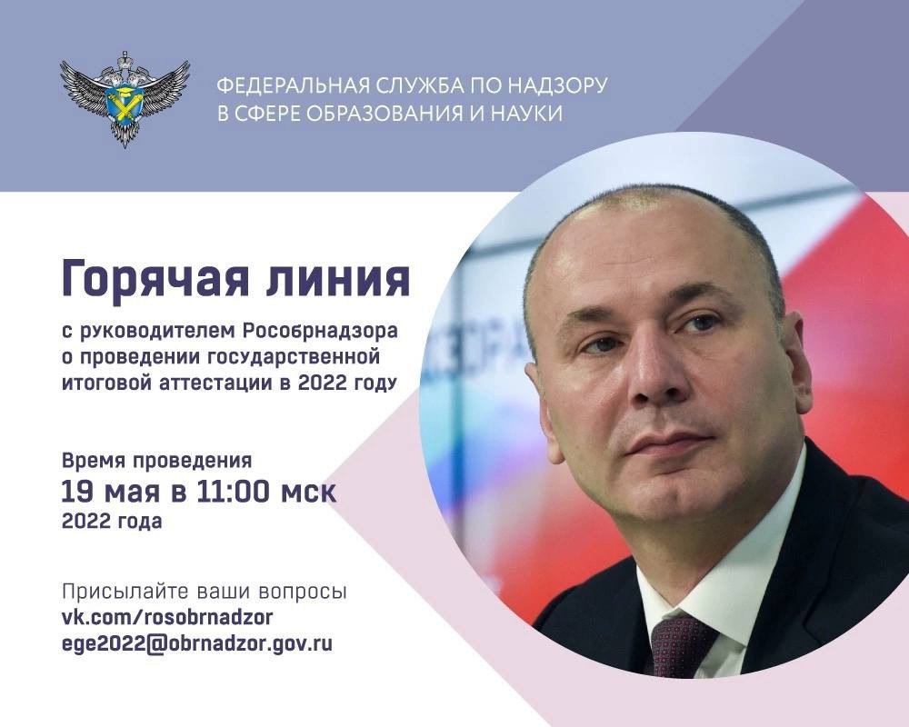 19 мая в 11:00 мск руководитель Рособрнадзора ответит в прямом эфире на вопросы о проведении ГИА в 2022 году. Трансляция будет вестись в прямом эфире в сообществе Рособрнадзора в социальной сети «ВКонтакте» https://vk.com/topic-36510627_48835101